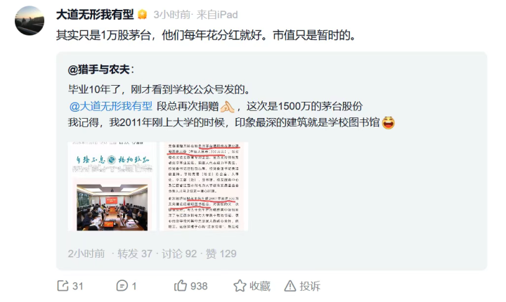 对此,段永平在其雪球账号“大道无形我有型”的主页上表示:“其实只是1万股茅台,他们每年花分红就好。市值只是暂时的。”
