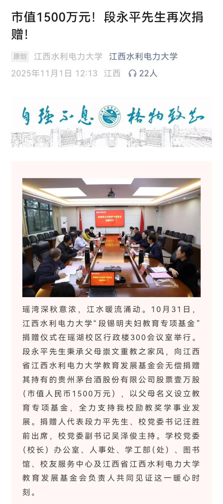 段永平向江西省江西水利电力大学教育发展基金会无偿捐赠其持有的贵州茅台酒股份有限公司股票壹万股(市值人民币1500万元),以父母名义设立教育专项基金,全力支持该校励教奖学事业发展。